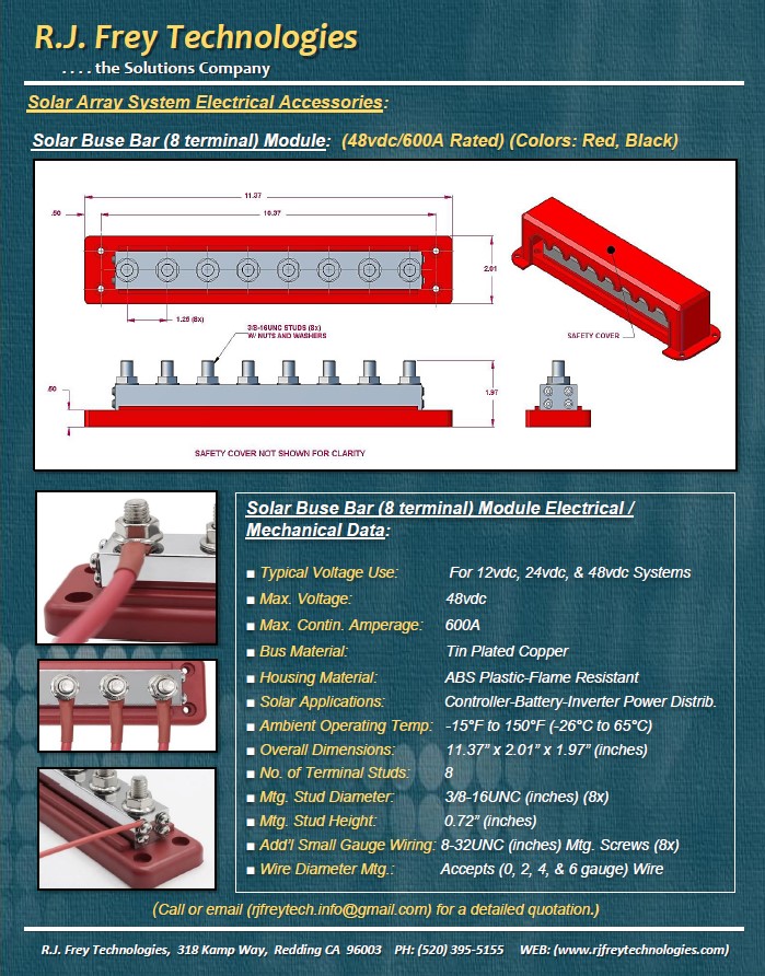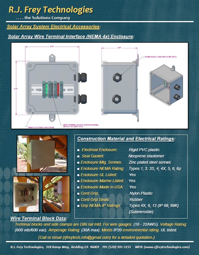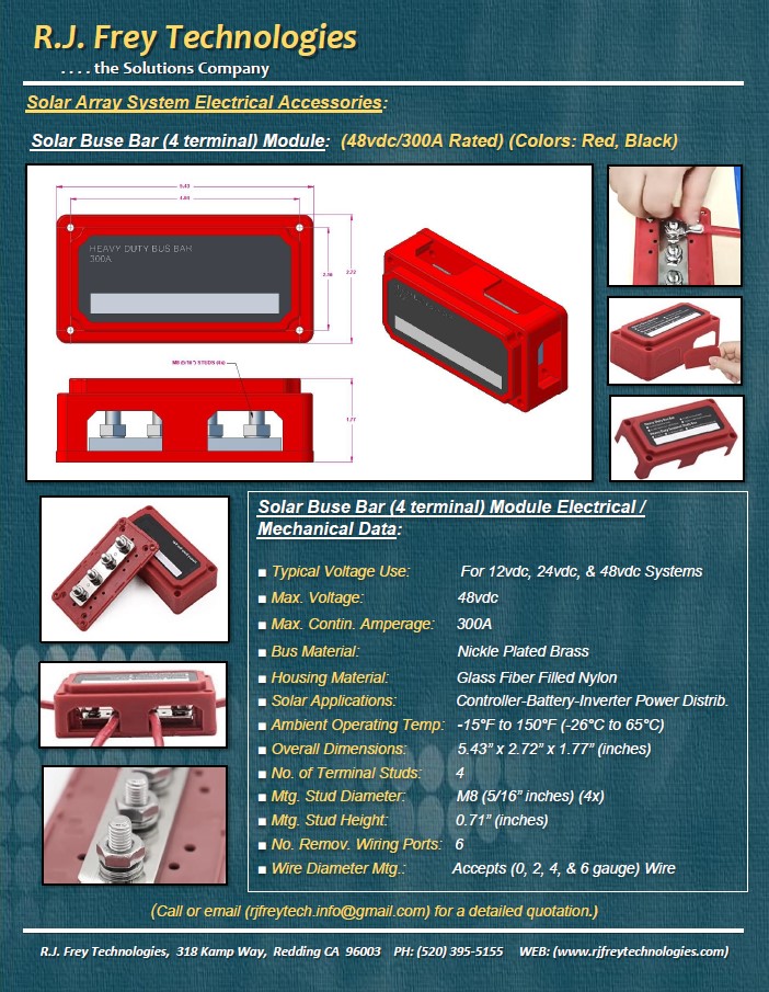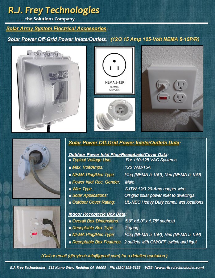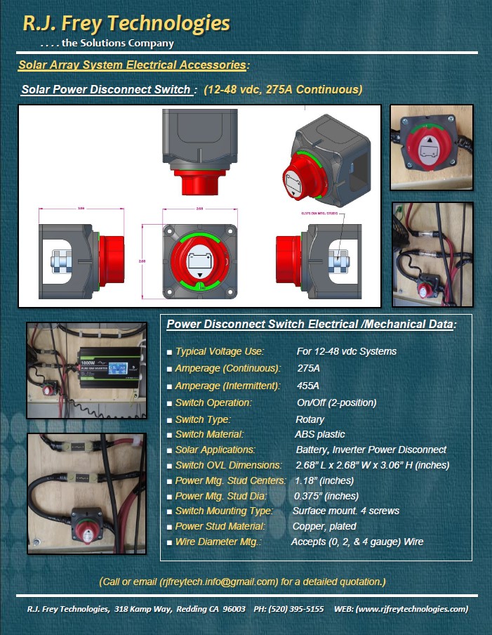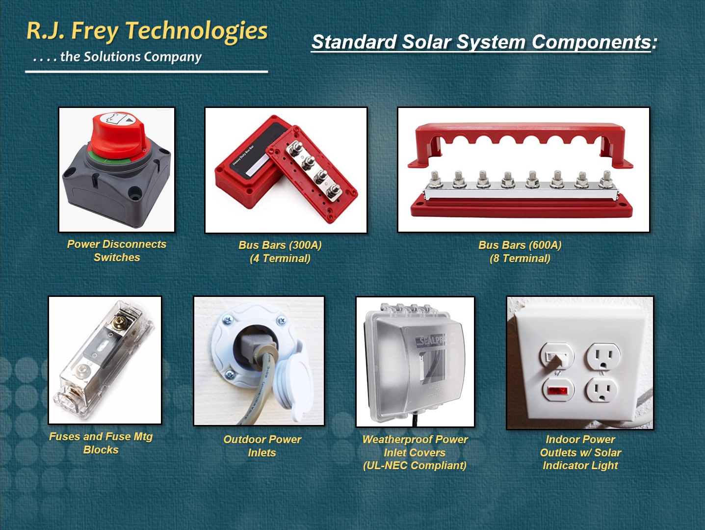Solar Energy Products: (System Accessories) System Accessories: R.J. Frey Technologies offers many high quality solar accessory components for custom “off-grid” systems. Each of these components are used in our standard systems. See Specification Data Sheets below: Like Loading...