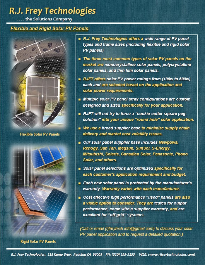 R.J. Frey Technologies offers a wide range of PV panel power ratings and frame sizes (including flexible PV panels) from (100w to 600w) from top solar panel suppliers such as Newpowa, Renogy, San Tan, Megsun, SunSol, S-Energy, Mitsubishi, Solaris, Canadian Solar, Panasonic, Phono Solar, and others. We use a broad supplier base to minimize supply chain delivery and market cost volatility issues.