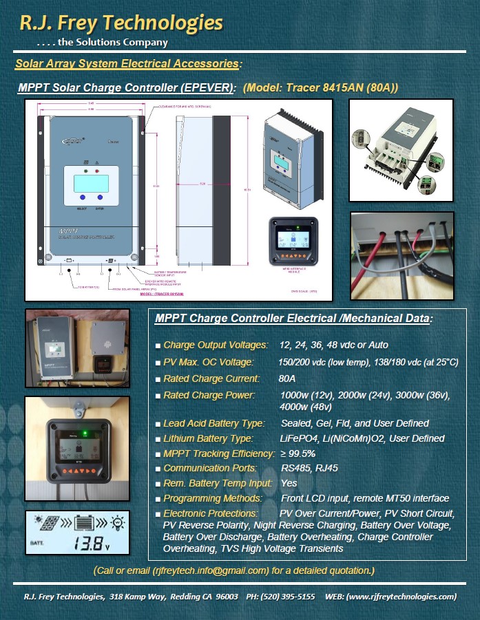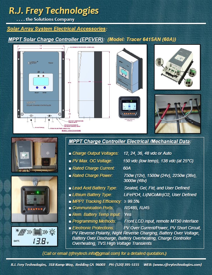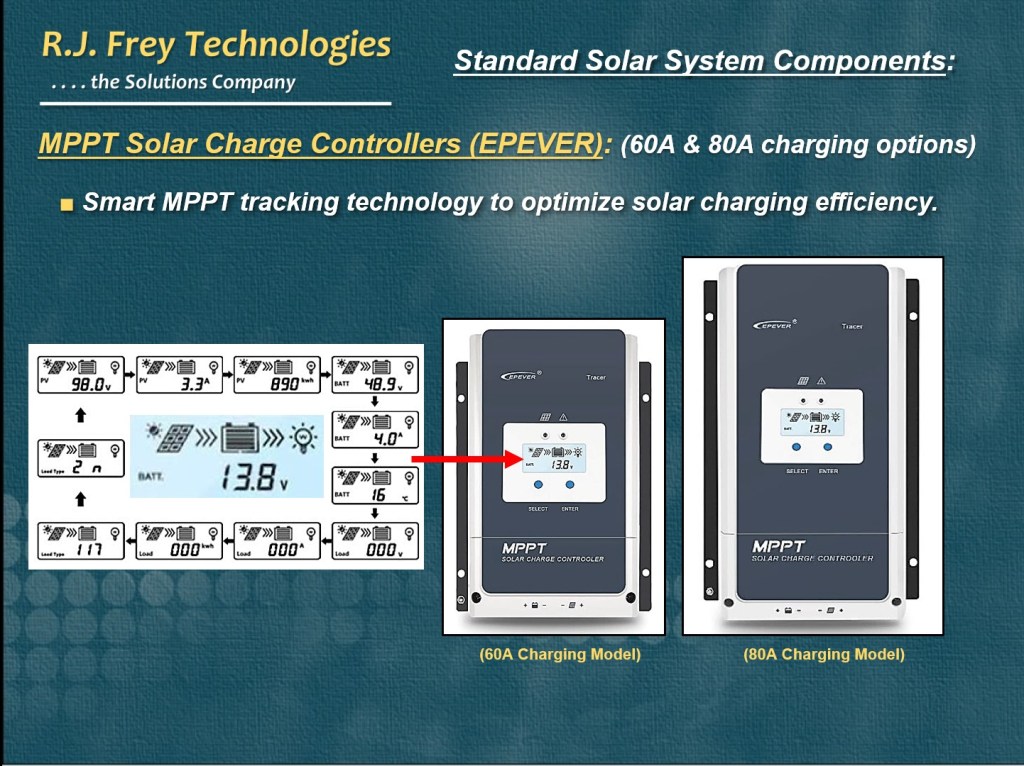 R.J. Frey Technologies has standardized on Epever and Victron MPPT charge controllers for all of our solar “off-grid” power back-up system designs with discrete components. We currently offer (35A, 45A, 60A, 70A, 80A, 85A, 100A, & 200A) charging options at various solar array voltages. The performance history of these MPPT solar charge controllers are excellent.